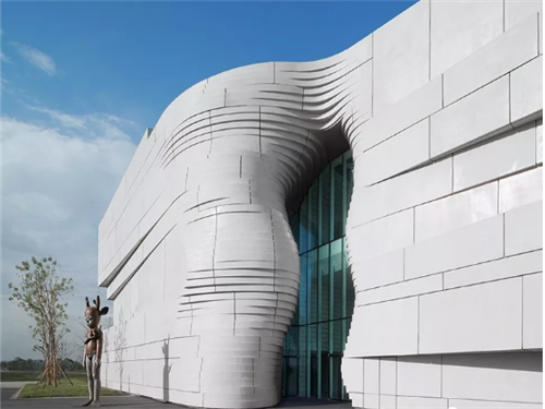 建筑立面設(shè)計大量采用不規(guī)則、無規(guī)律的線條來表現(xiàn),藝術(shù)美術(shù)館整體建筑呈長條狀,為充分體現(xiàn)出橫向的線條設(shè)計感,立面裝飾的每塊板的分格需要較大,GRC板是理想的替代材料,最大板塊橫向長度達到近4米,這是其他材料(如石材、水晶石、人造板等)無法做到的。